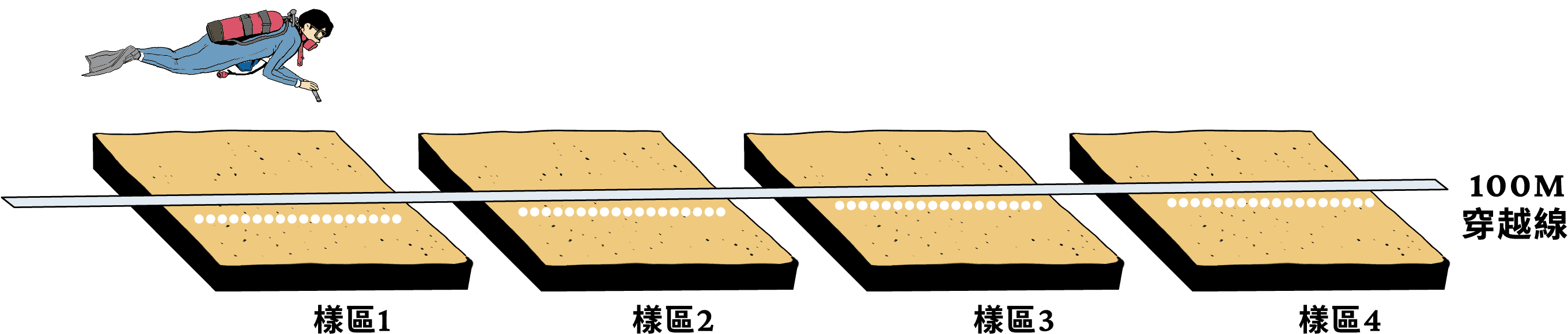 由佈線員拉出100公尺長的穿越線(穿越線鋪設的深度區間須盡量控制在正負一公尺範圍內), 並劃分4個子樣區,每個子樣區為20公尺,並於子樣區之間間隔5公尺跳過不予記錄